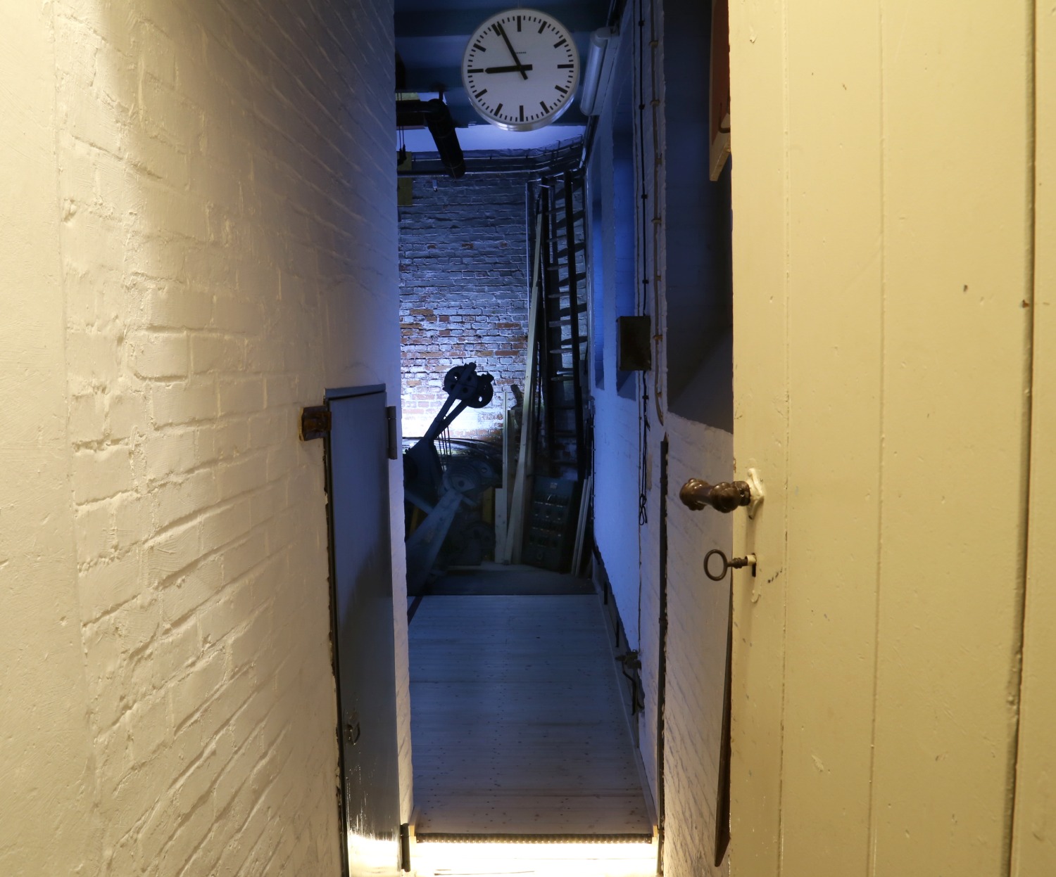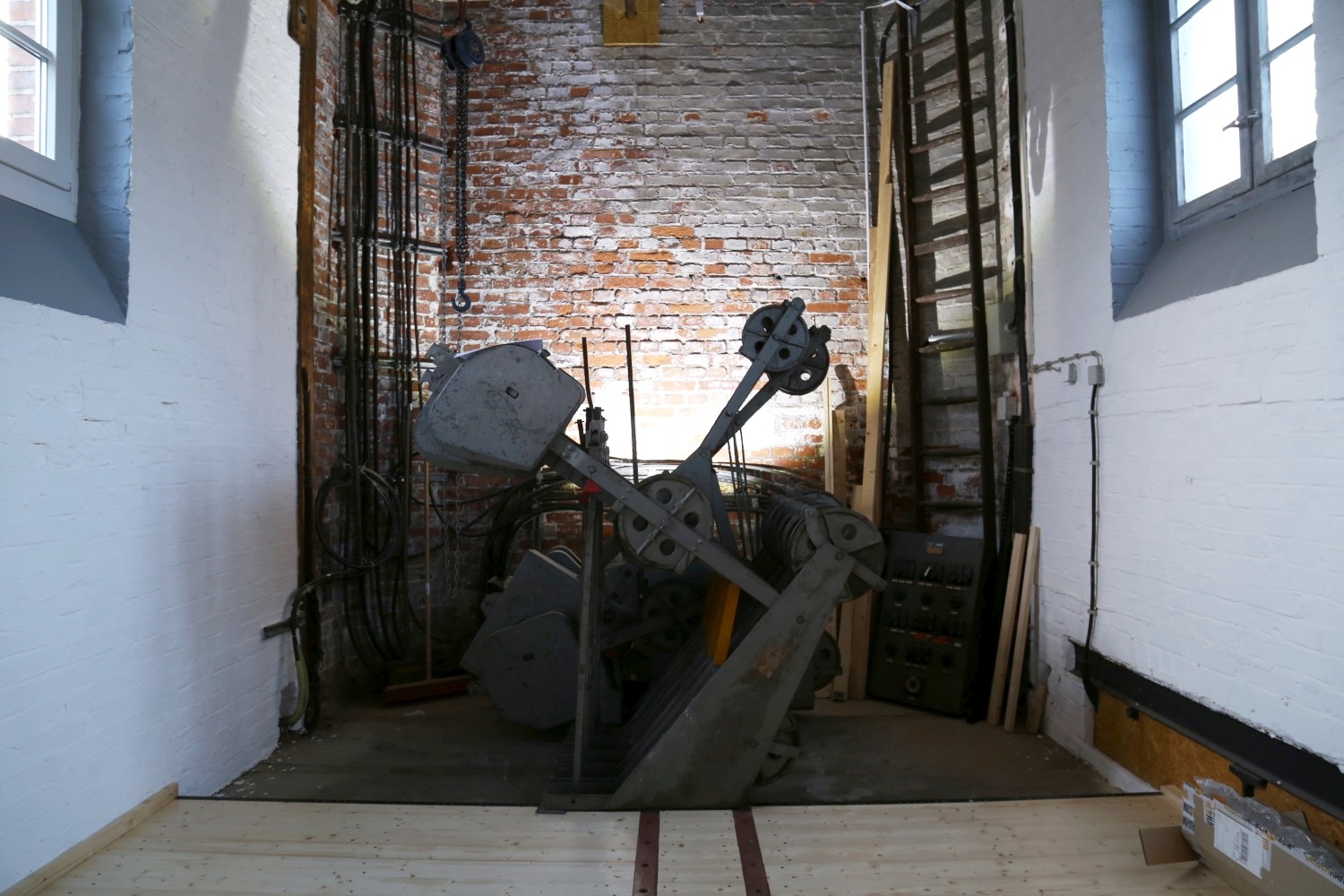 ![]() Bei der Renovierung des Spannwerkraums im Stellwerk Do wurde darauf geachtet, dass wenigstes an einer Wand der ursprüngliche Zustand erhalten geblieben ist. Um Platz für einen kleinen Veranstaltungs- und Ausstellungsraum zu schaffen, mussten 4 Spannwerke verschrottet werden und die restlichen Gewichte und Umlenkrollen auf engstem Raum zusammengeschoben werden. Die Schienen für die Befestigung der Spannwerke wurden in den Boden eingearbeitet. |
