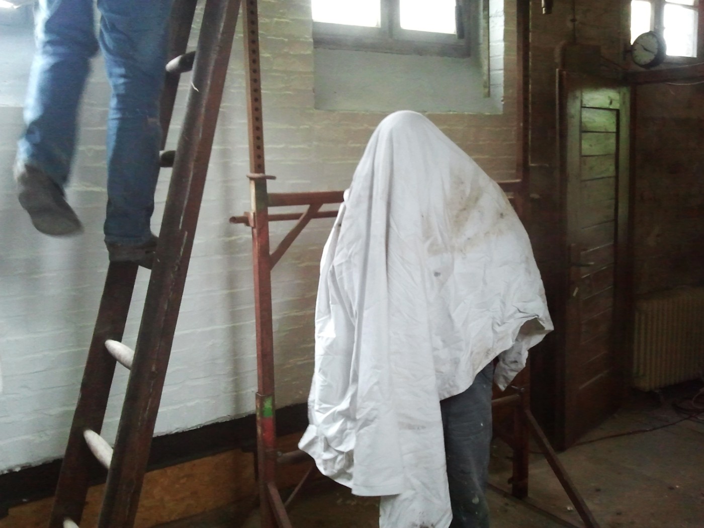 ![]() Keine Gespensterstunde, sondern eine praktische Verkleidung, um sich vor dem enormen Staubanfall bei der Deckenrenovierung zu schützen. (Etwas Spaß muss sein.) |