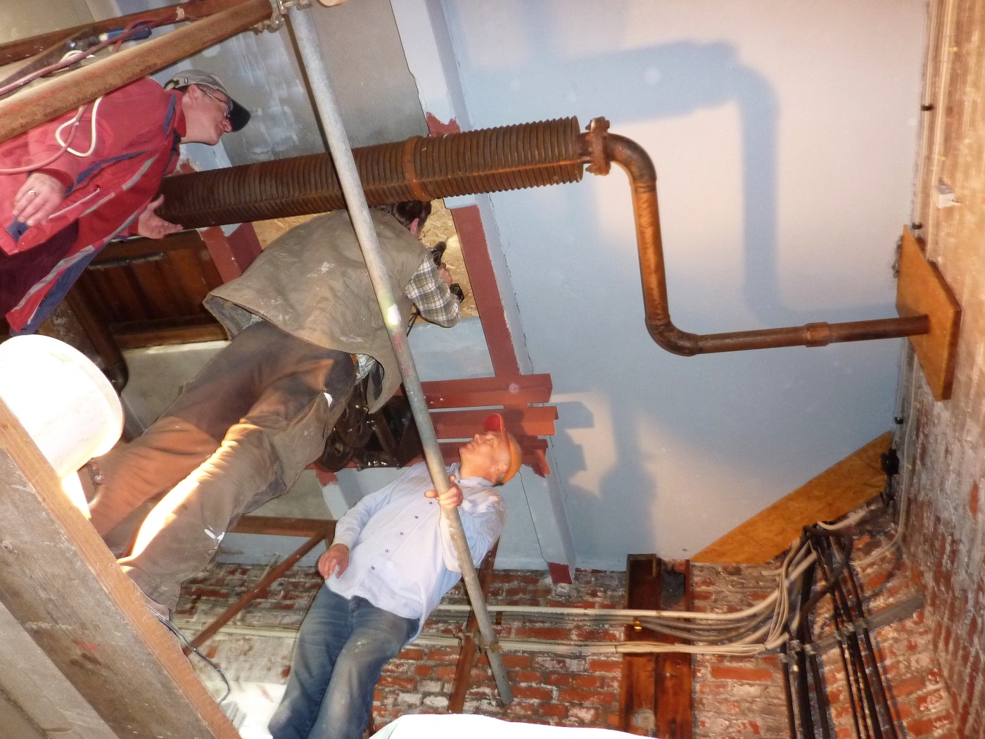 ![]() Bis es so weit war mussten viele Stunden Arbeit geleistet werden. Die Raumhöhe von über 4 Metern erforderte ein aufwändiges Gerüst. |