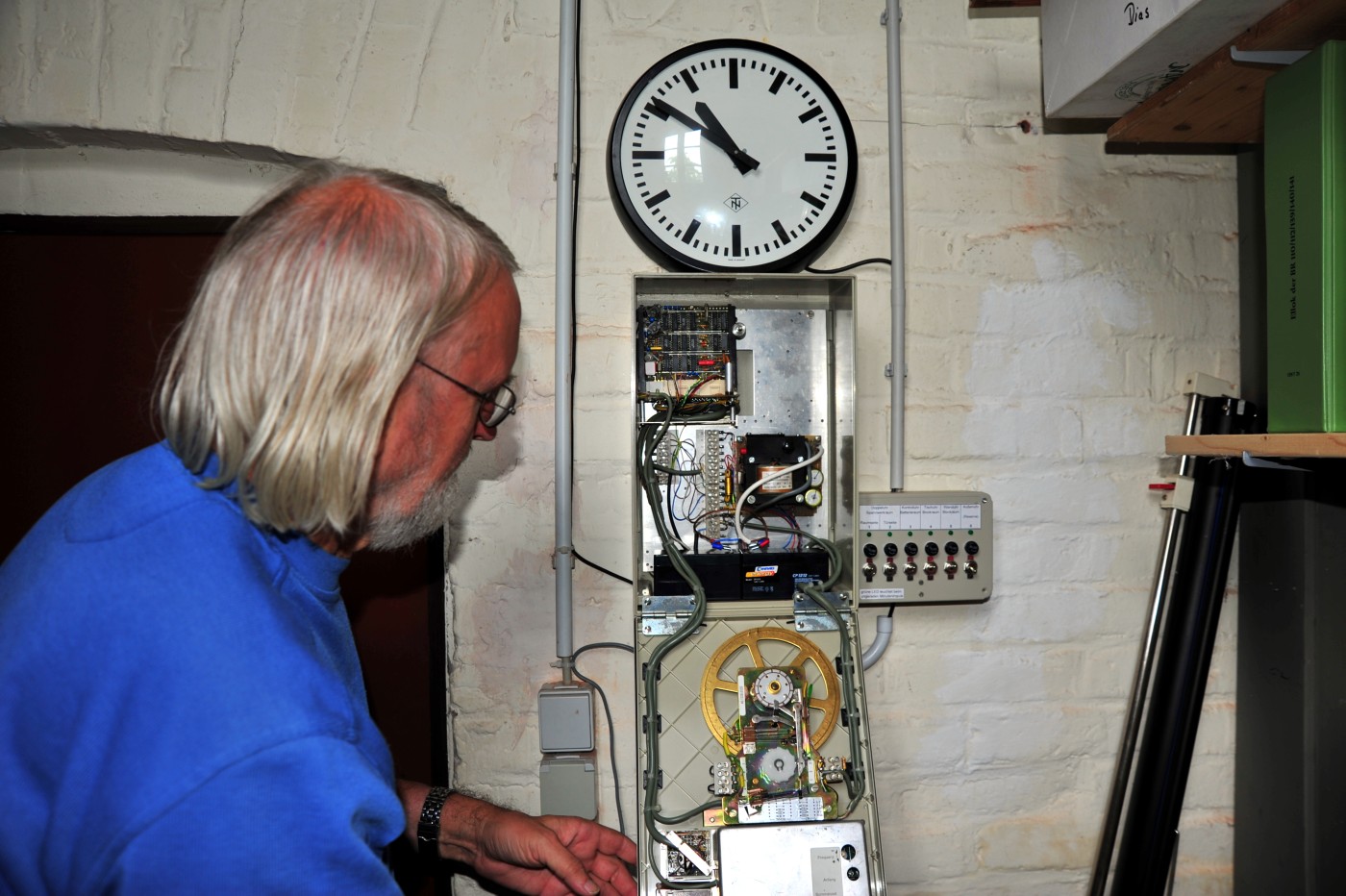 ![]() Die vom Langenwellensender DCF77 synchronisierte Hauptuhr in der Uhrenzentrale. Von hier werden 6 Nebenuhren im Stellwerk durch Minutenimpulse gesteuert. |